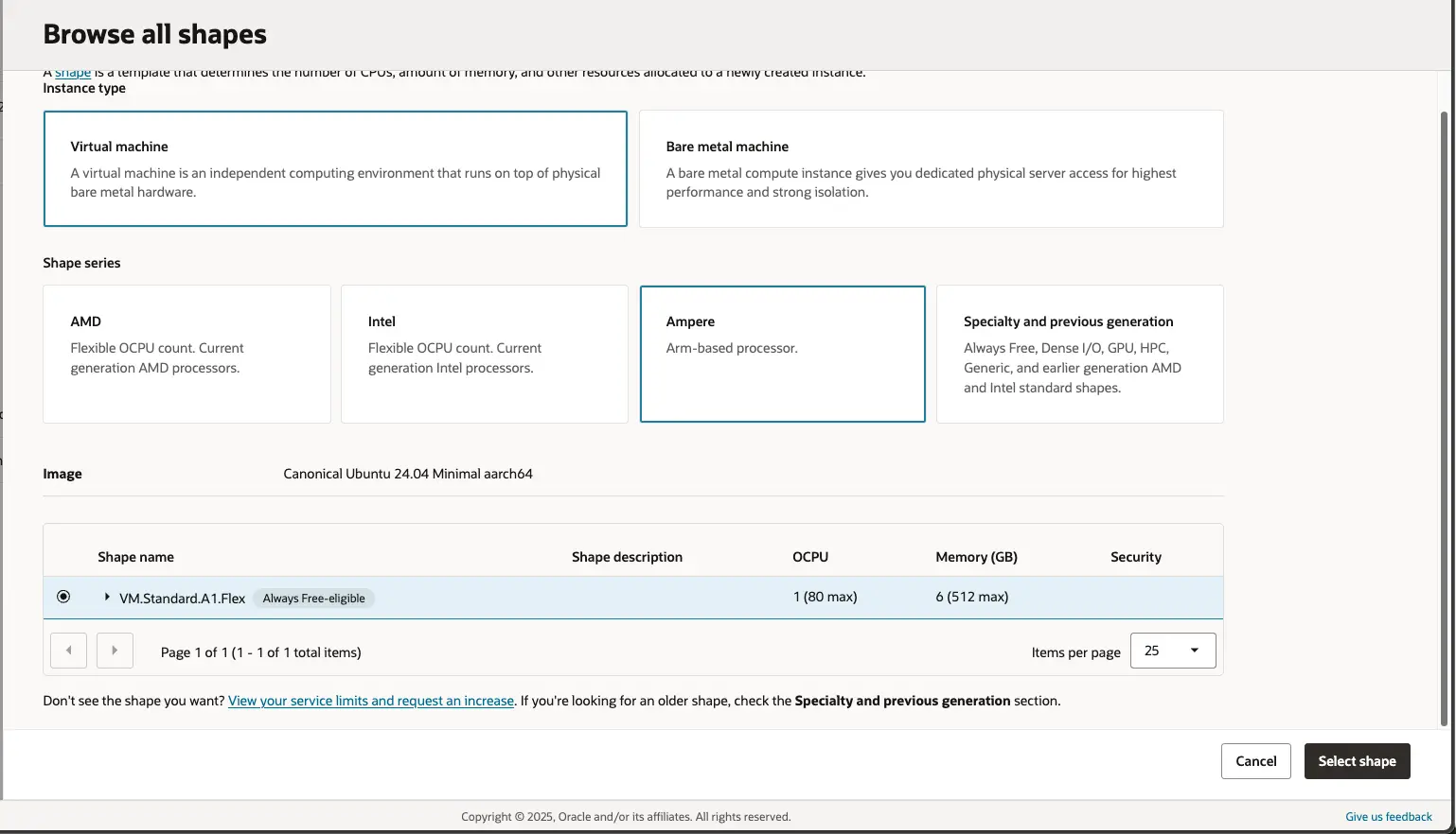 그래서 Ampere를 쓸 경우 최소 1대 - 최대 4대까지 리소스(총합 OCPU 4 / RAM 24GB 내)를 분산하여 사용할 수 있어요.
