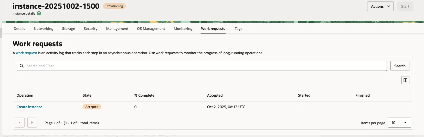 Work requests 라는 메뉴로 이동되며 인스턴스가 생성중인 것을 볼 수 있어요.
