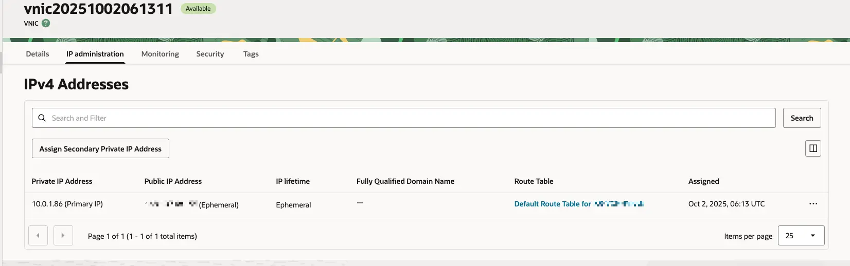 그럼 아래와 같이 VNIC에 연결되어있던 Public IP Address가 '(Not Assigned)'로 변경돼요.