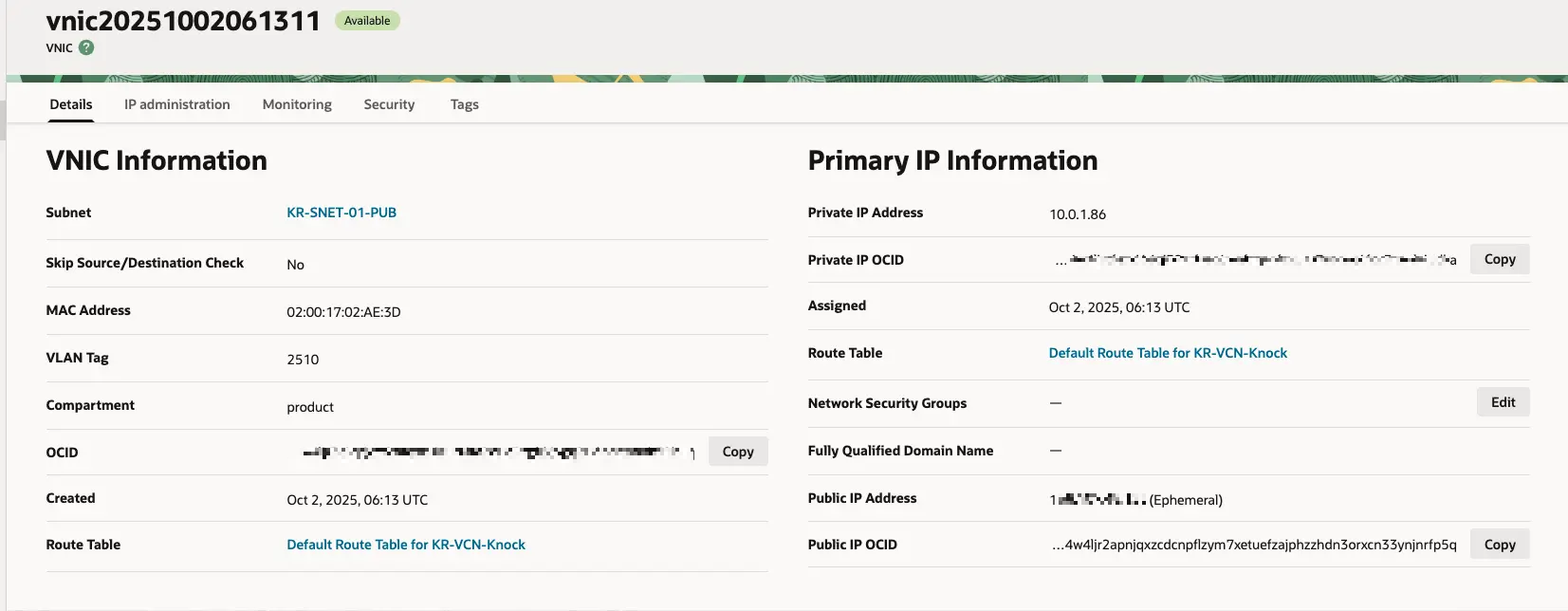 그럼 아래와 같이 VNIC에 설정된 Private IP와 Public IP 정보를 볼 수 있어요.