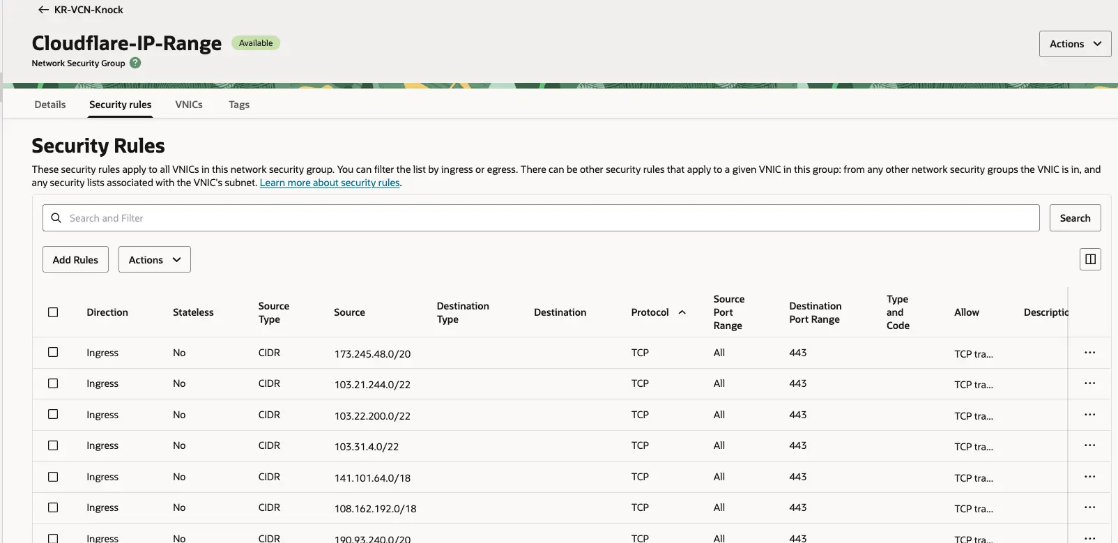 • 경로: OCI Console → Networking → VCN → Network Security Groups → Cloudflare NSG / Instance NSG 각각 생성 → Ingress 규칙 추가