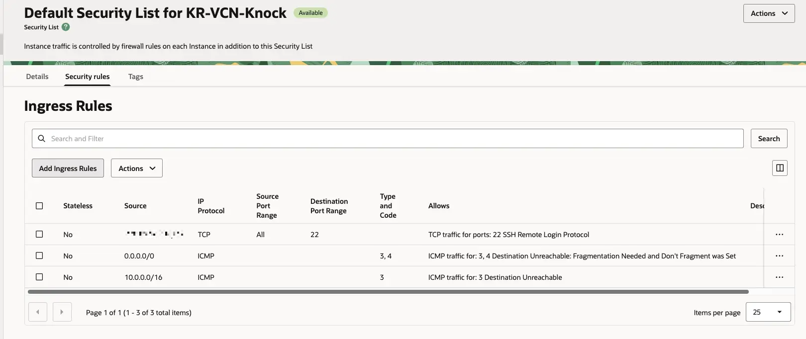 경로 : OCI -> Networking -> Virtual Cloud Networks -> [ 생성한 VCN 선택 ] -> Security