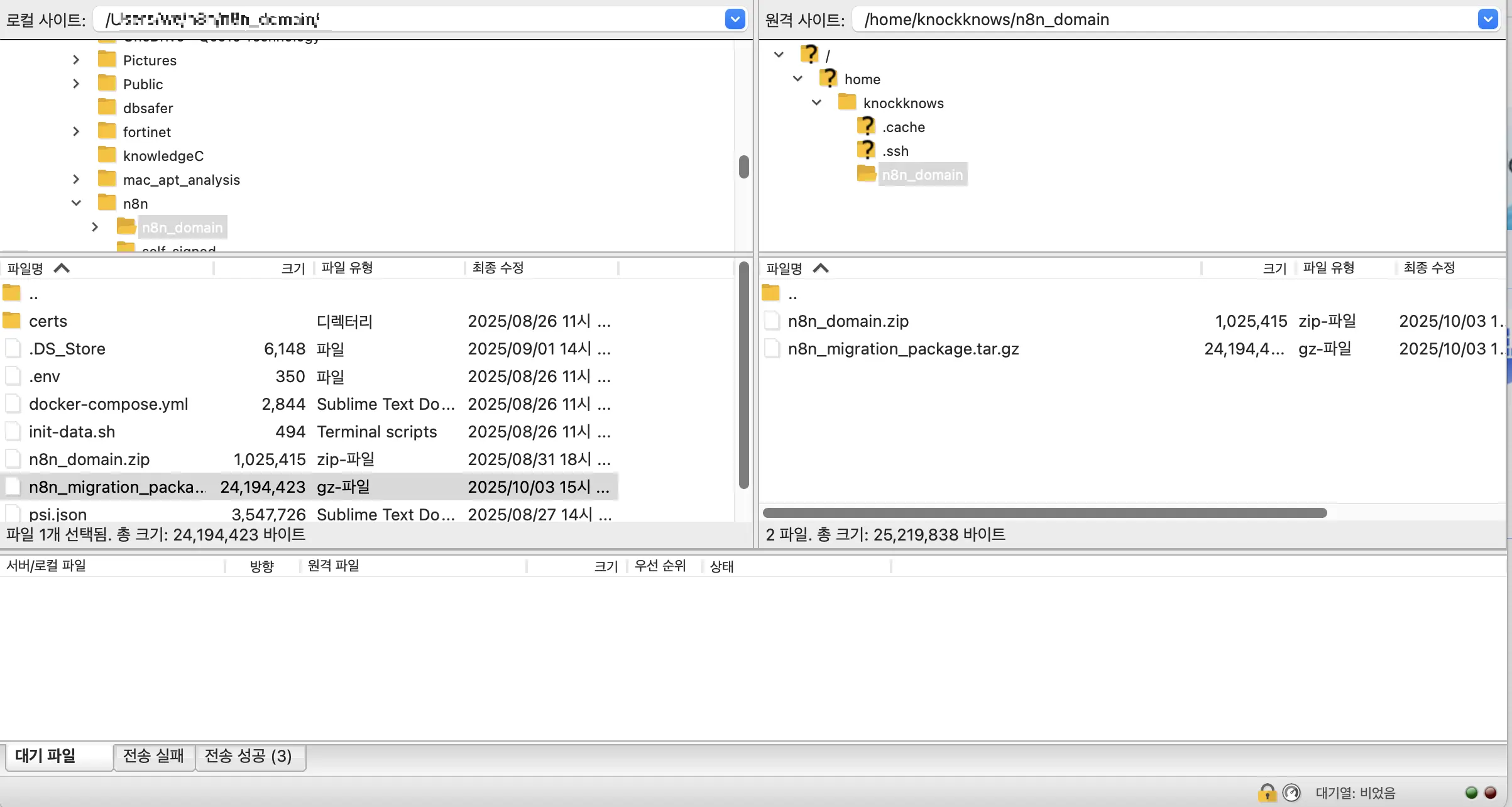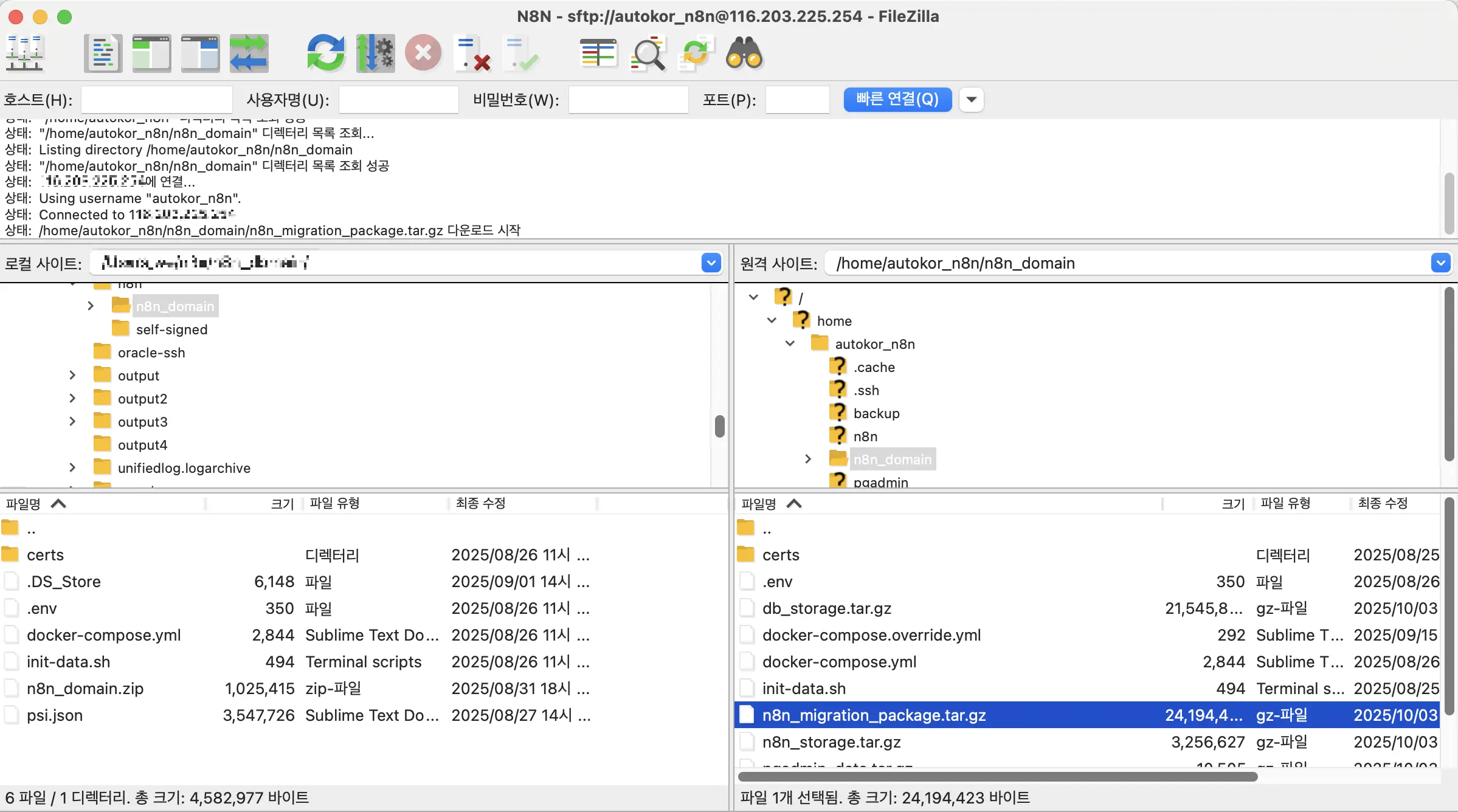 저는 'migration_package.tar.gz' 내 볼륨 백업 파일까지 전부 포함되어 있기에 해당 파일만  Filezilla를 통해 가져왔어요.
