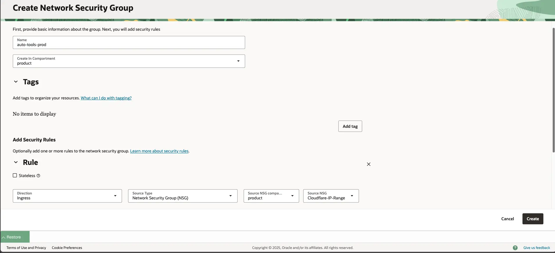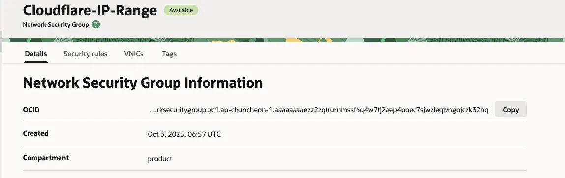 - 경로: OCI Console → Networking → VCN → Network Security Groups → Cloudflare NSG / Instance NSG 각각 생성 → Ingress 규칙 추가