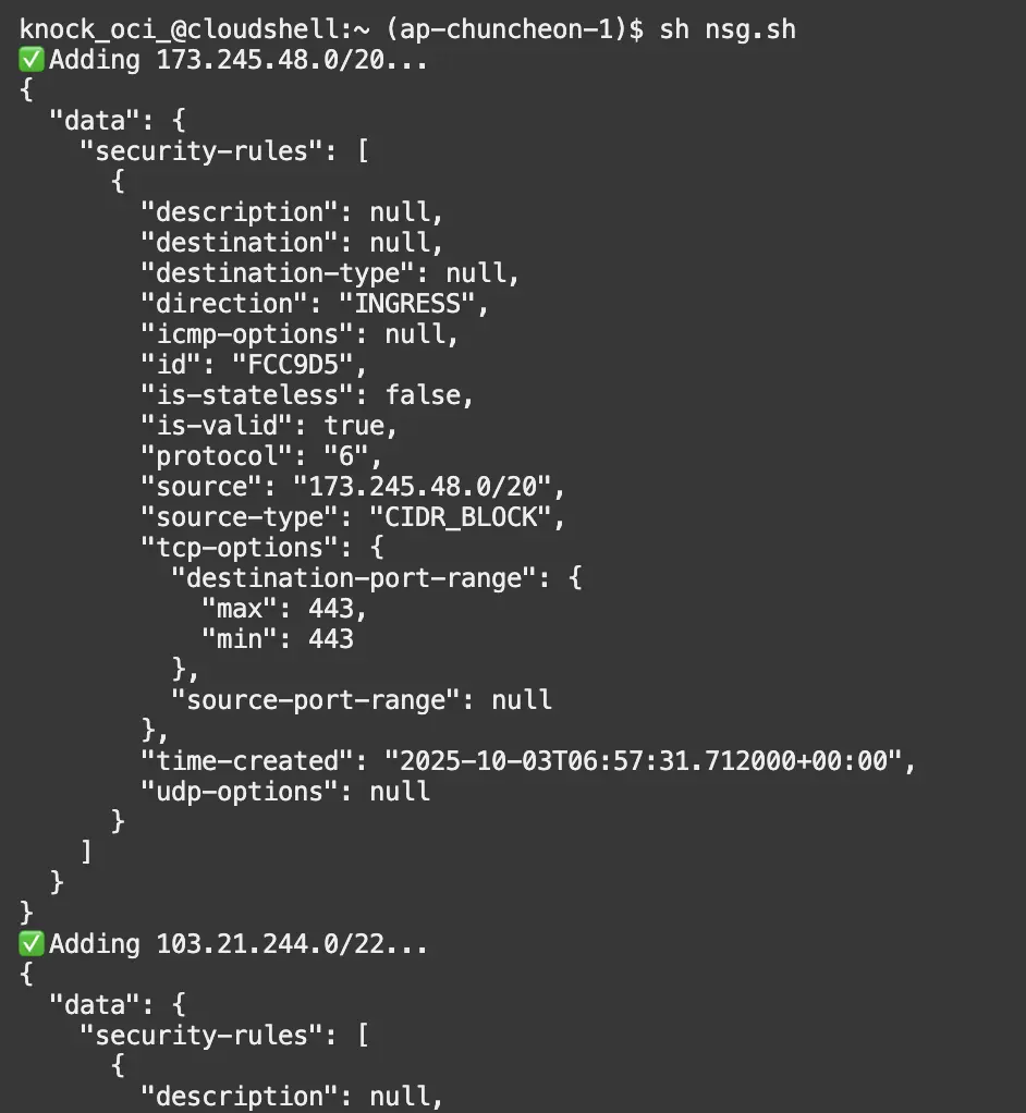 그럼 스크립트가 실행되면서 저희가 생성했던 NSG에 Cloudflare IP가 등록돼요.