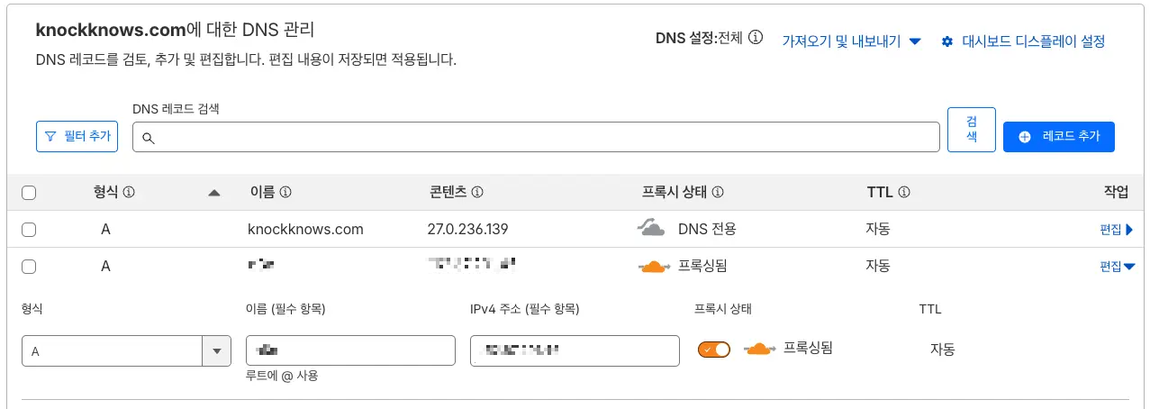 클라우드플레어 도메인 레코드에서 도메인과 연결된 IP 수정이 필요해요.