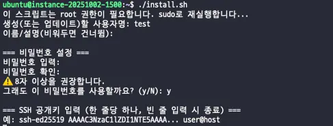 위 스크립트를 실행하면 아래 정보를 입력받고, 입력받은걸 토대로 계정을 생성해요.