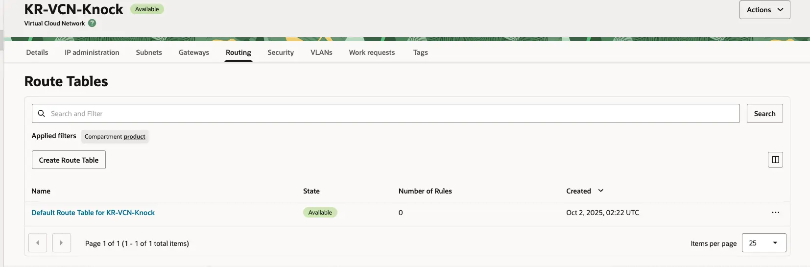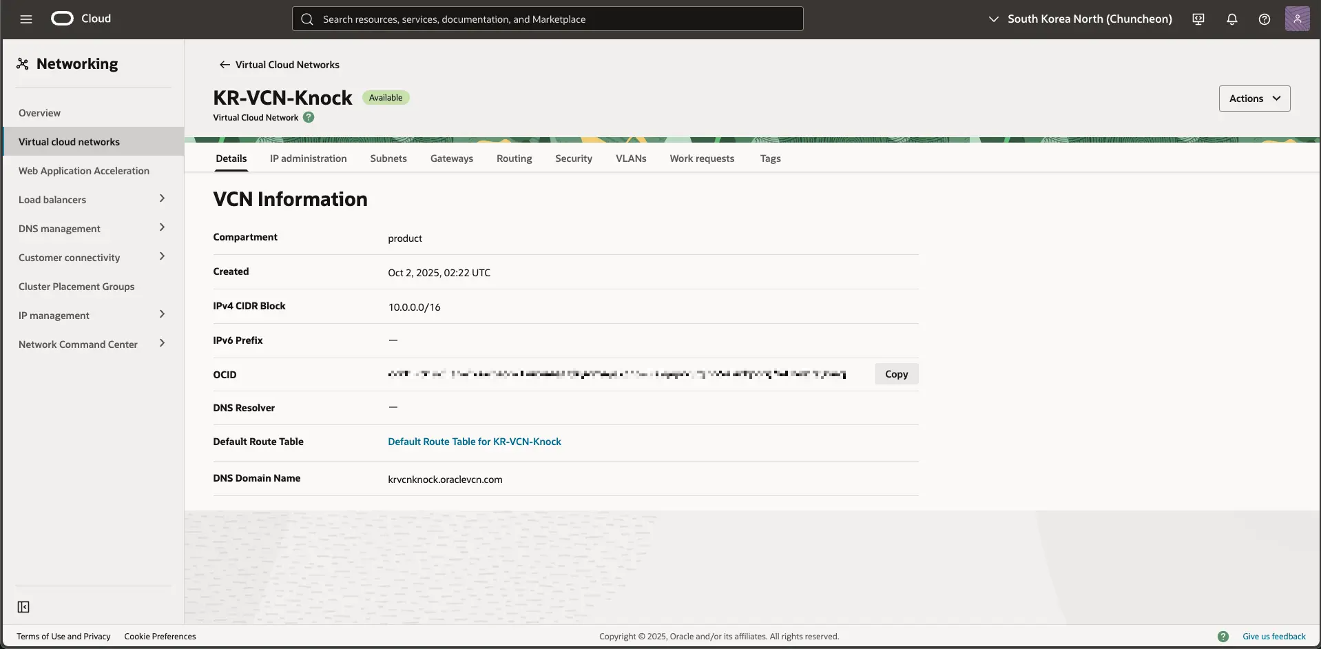 | Compartment | VCN이 속할 Compartment 선택 | 첫 부분에서 만든 Compartment로 지정 |