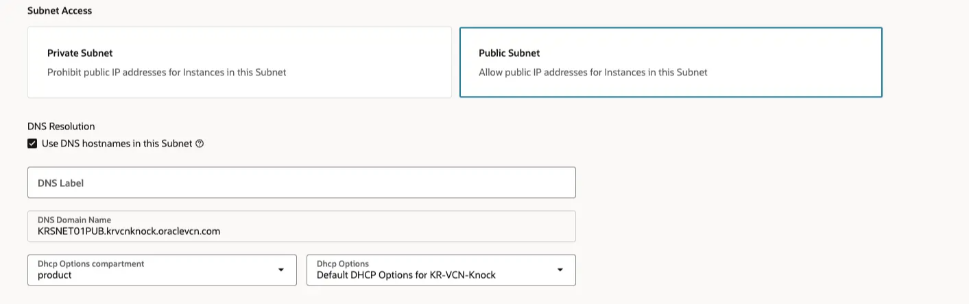 | IPv4 CIDR Blocks | 서브넷에 할당할 IPv4 CIDR(예: 10.0.1.0/24) *VCN에 속하면서 그보다 작은 CIDR 지정 |
