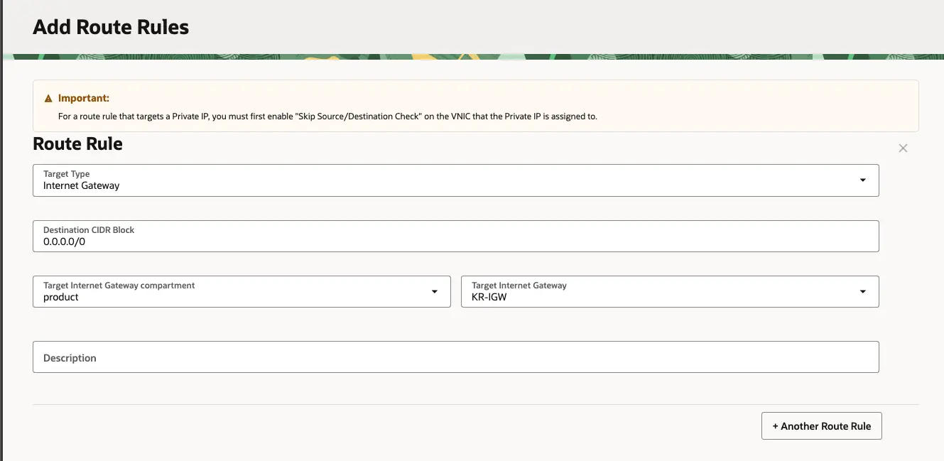 라우팅 테이블 내부 -> [ Route Rules ] -> [ Add Route Rules ] 버튼을 눌러주세요