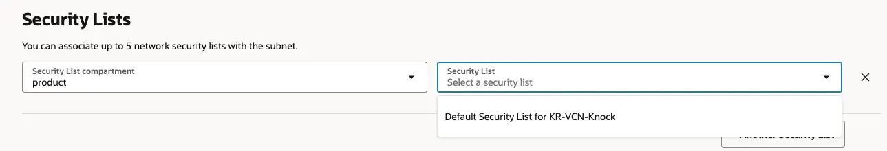 그리고 마지막에 Security List를 선택하는데 기본적으로 Default Security List가 생성되어 있으므로 해당 List 선택해주세요.