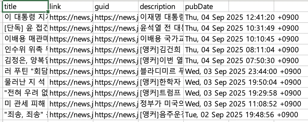 실습 흐름 요약: 매일 9시 JTBC 속보 RSS를 GET → XML→JSON 변환 → channel.item만 분리 → 엑셀(XLSX)로 저장.