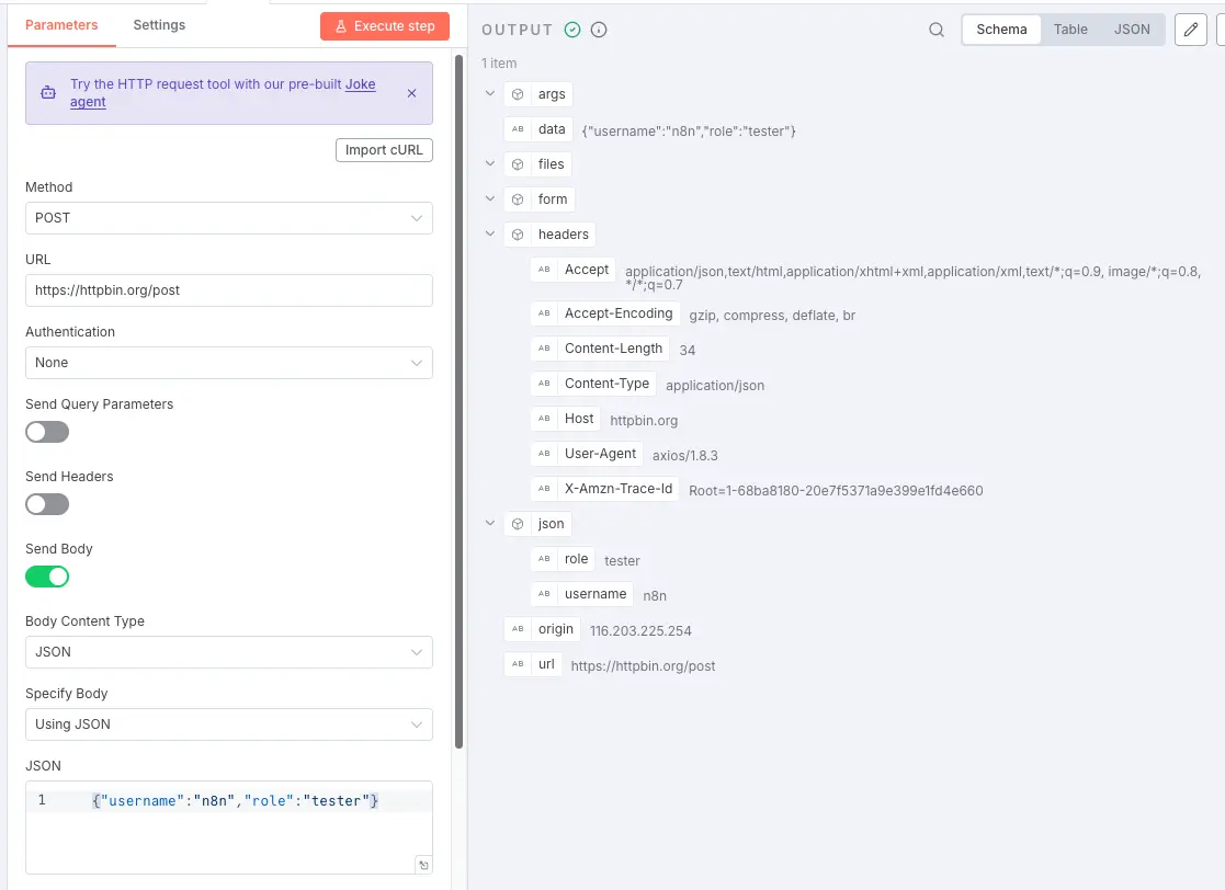 2. Body: JSON, {"username":"n8n", "role":"tester"}